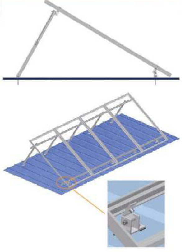 做角度支架安裝類型: 適用于彩鋼瓦,水泥屋頂 A. 結(jié)構(gòu)上,加入了防水墊作為底座的一 部分,來進(jìn)行防水; B. 防水墊的特點(diǎn):對雨水進(jìn)行分流,避 免雨水流入鉆孔處。 產(chǎn)品特點(diǎn): 1. 現(xiàn)場安裝零件少。產(chǎn)品模塊化設(shè)計(jì),零件在工廠已預(yù)裝,現(xiàn)場安裝零件只有8個(gè); 2. 安裝工具簡單。標(biāo)準(zhǔn)化程度高,安裝工具簡單、數(shù)量少,僅3個(gè); 3. 角度可根據(jù)安裝地點(diǎn)改變,通用性強(qiáng)。 產(chǎn)品性能: ●屋頂類型:彩鋼瓦、 瀝青瓦; ●材料:鋁合金6005和不銹鋼304; ●組件類型:邊框或無邊框; ●組件方向:橫放或豎放; ●地貌類型:B,C; ●設(shè)計(jì)風(fēng)速:45m/s; ●雪載荷:1.4KN/m2; ●角度調(diào)整范圍:10*-15*、15"~30° 、30°-60°。 |
